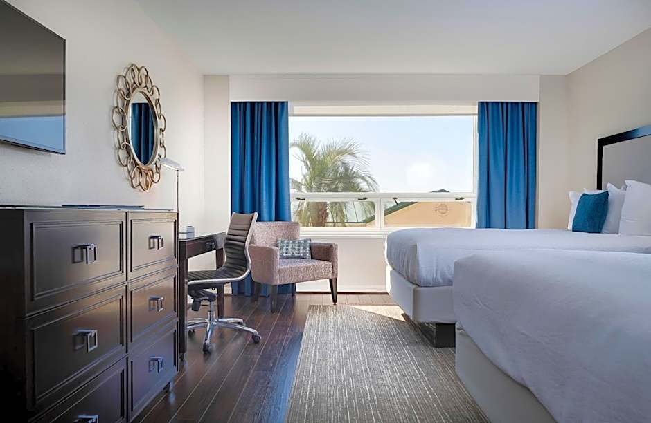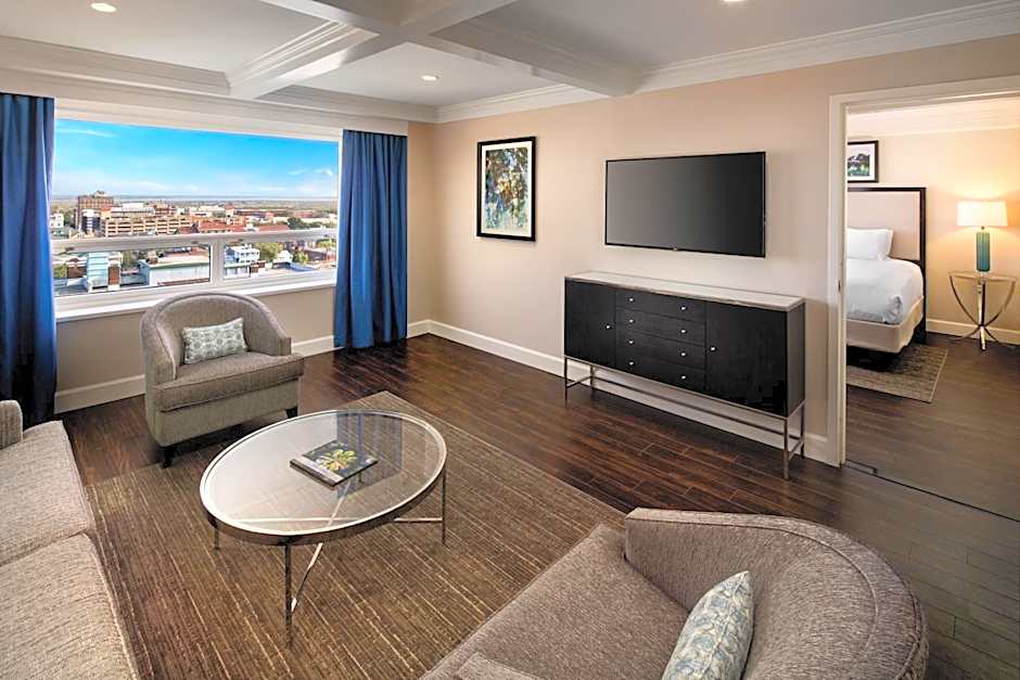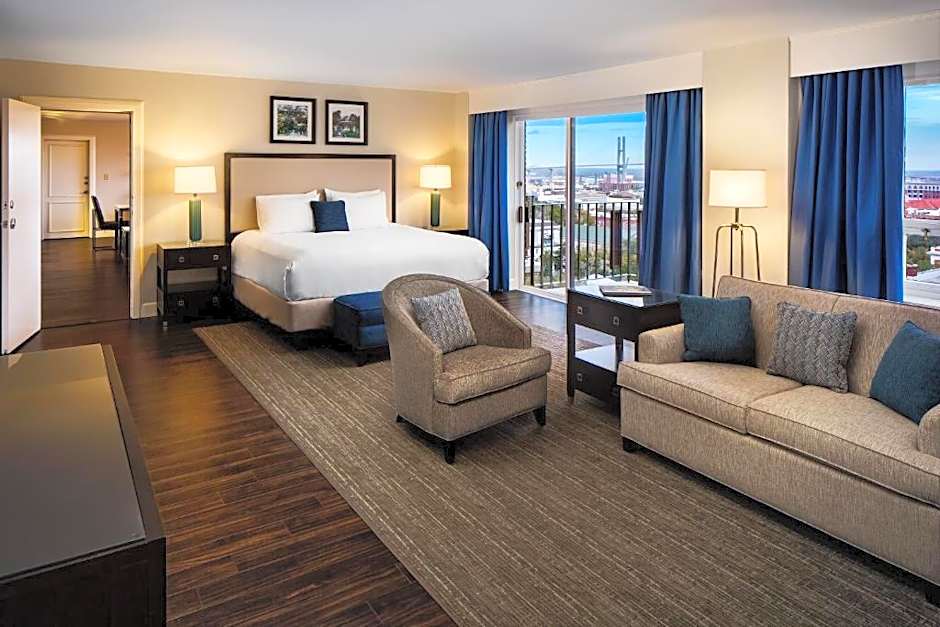 This suite features a balcony, seating area a microwave, refrigerator, desk, and air conditioning.